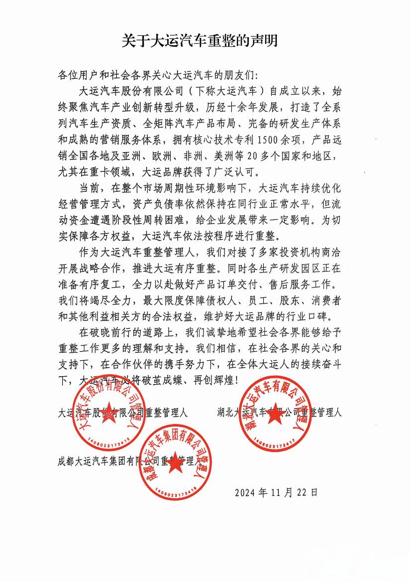 關于大運汽車重整的聲明